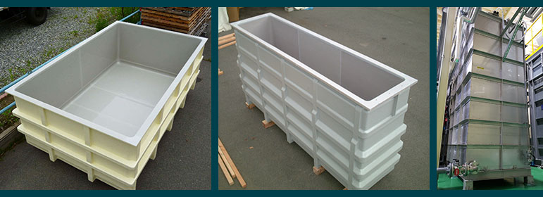 液の種類、温度等に適した材質の選定から、設計製作まで行っております。PVC槽・FRP槽・PP槽・ステンレス槽・鉄槽など、各種対応いたします。ゴムライニング処理のご相談も承ります。