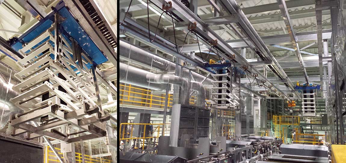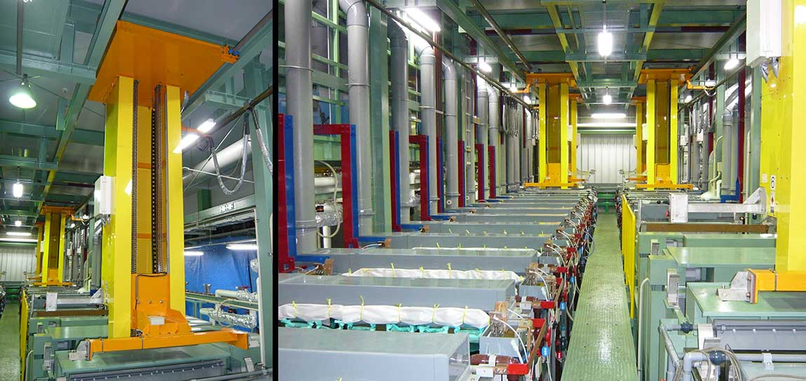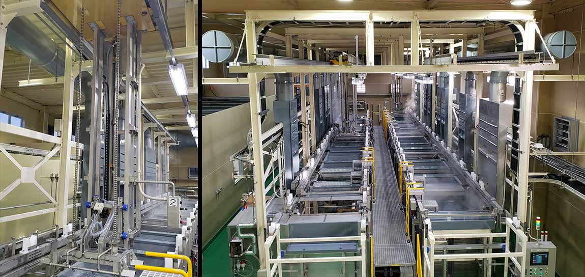処理工程に合わせた処理槽を円周状に設置し、治具を取り付けたハンガーやバレルを一斉に昇降させる方式の装置です。大量生産に適しております。